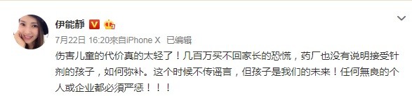 一向關心時事且有2歲女兒的伊能靜則認為不肖業者傷害兒童的代價太輕,語帶不滿:「幾百萬買不回家長的恐慌,藥廠也沒有說明接受針劑的孩子,如何彌補。這個時候不傳謠言,但孩子是我們的未來,任何無良的個人或企業都必須嚴懲!」