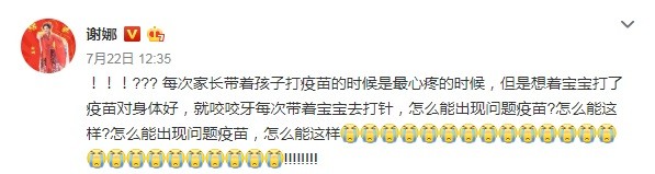 育有2歲女兒的章子怡爆粗口痛罵:「告訴我給孩子的疫苗都造假,還有什麼不可以!?TMD。 」而今年剛生下雙胞胎女兒的謝娜認為寶寶打疫苗對身體好,因此就算不捨也會咬牙帶孩子去施打,現在疫苗卻出問題,讓她不可置信的說「怎麼能出現問題疫苗」,她的老公張杰亦憤怒說:「信任是建立在值得被信任的基礎之上,那些做賣假藥的,你良心何在?」
