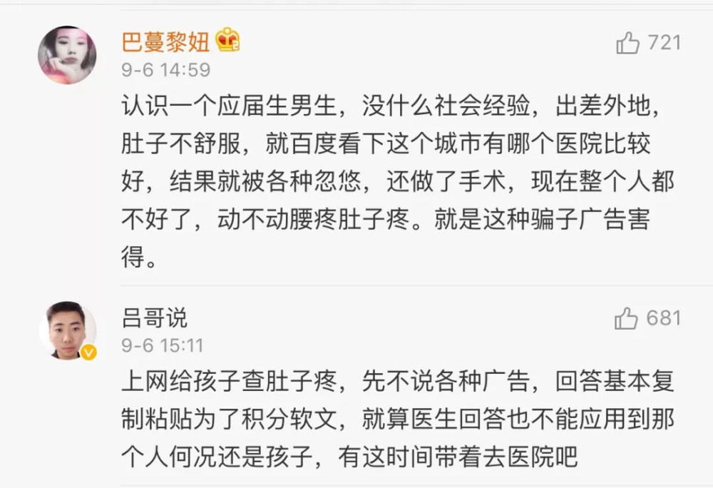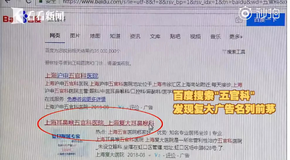 正如这位网友所言: 网上搜医院,又有患者被骗 昨天,还有一条与百度有关的新闻,引发网友关注。 @看看新闻 9月6日报道,宁波的周小姐想去复旦附属眼耳鼻喉科医院看鼻炎,但查了百度几次都显示的是上海场中路的复大医院。周小姐被对方诊断为慢性肥厚性鼻炎,当场缴费近万元做了切除鼻甲手术。