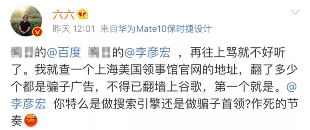 昨天,作家六六的一条微博,又把百度送上了热搜。 9月6日,女作家@六六 在微博上发帖吐槽,称她在百度上查找上海美国领事馆官网的地址,搜索出来的全是骗子广告链接。最后不得已上谷歌,在谷歌上搜索出来的第一个就是正确地址。并质疑李彦宏“是做搜索引擎还是做骗子首领?”