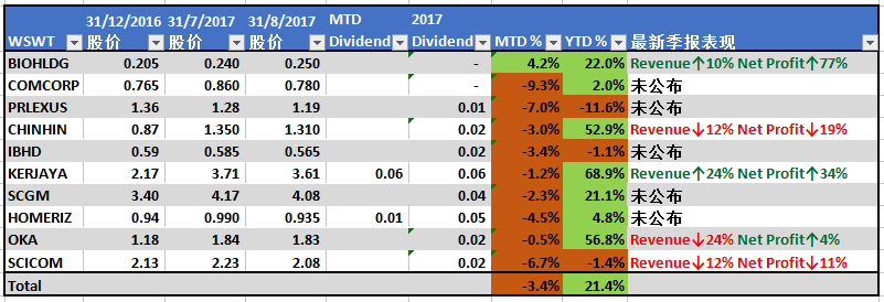 WSWT 2017年投资组合8月份表现 - 所有股票表现下跌,BIOHLDG一支独秀!