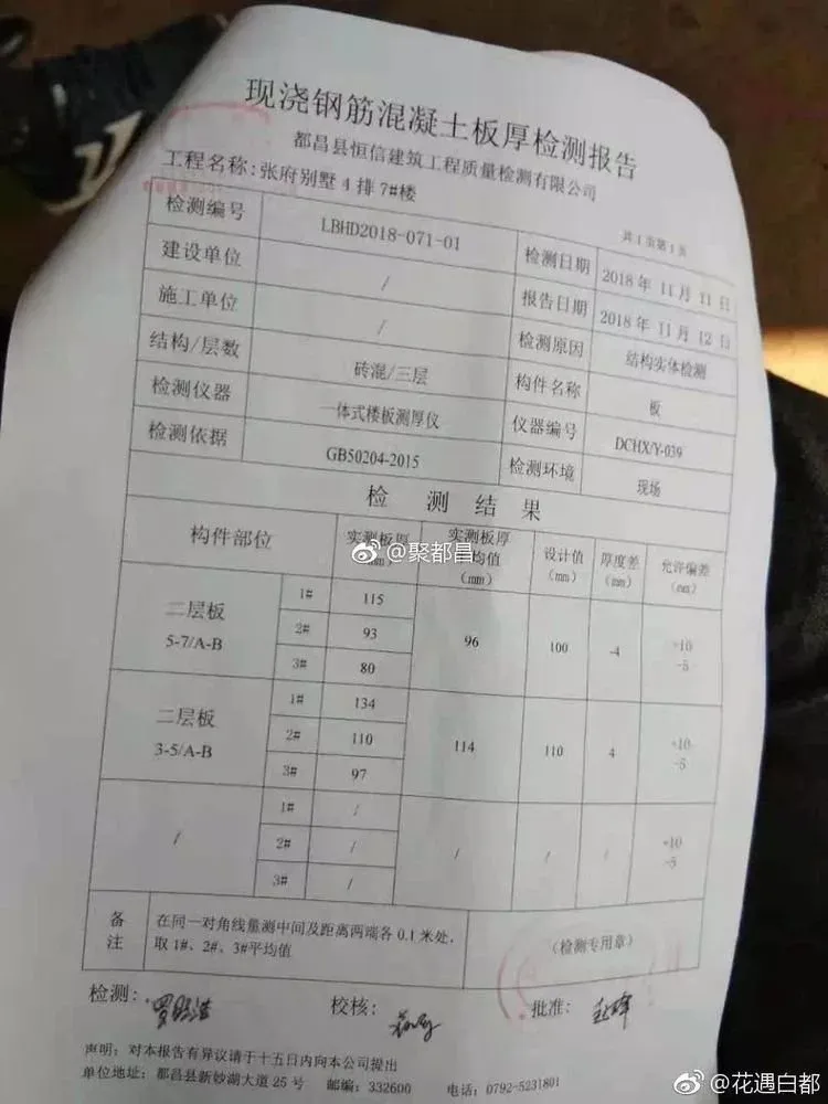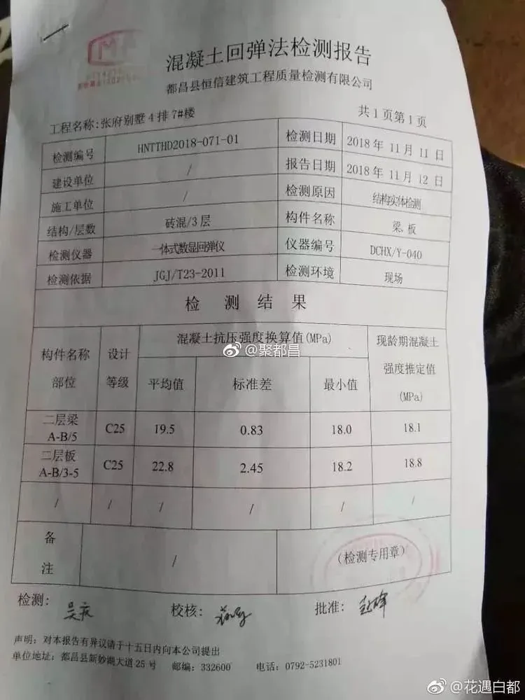 11 月2 日,村民将此事反应给乡政府,11 月8 日,乡政府召集村民开会,提出邀请检测的机构检测,11 月11 日,村里请来县检测机构,通过检测,楼面强度只有18.8,离设计图纸强度C25 相差甚远!名副其实的豆腐渣工程!(附检测报告!)